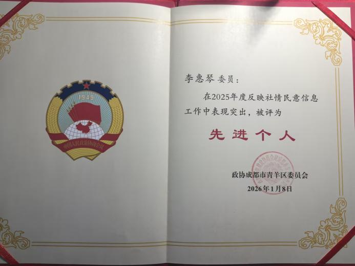 充分发挥桥梁纽带作用,平台负责人李惠琴以政协委员身份履职尽责,提交的《打造航空新城创新服务生态·开启“立园满园”新探索》联名提案入选会议发言材料汇编。获评2025年度社情民意信息“先进个人”,展现了新时代政协委员的履职风采。
